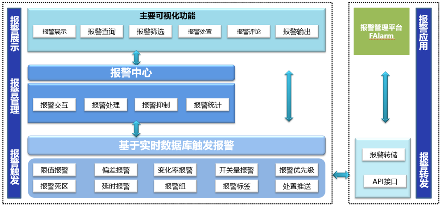 通過數據庫配置執行、后臺處理、前端展示的模式確保報警觸發的實時性。報警多級別、多類型、多結構,以及多客戶端顯示/確認的設計便于客戶高效處理和篩選報警信息。