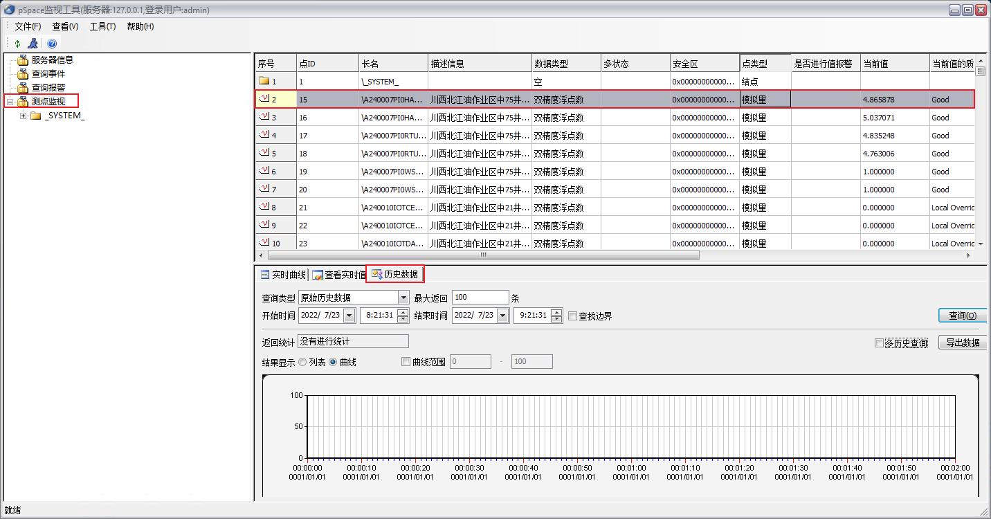 同樣使用pSpace管理工具psMonitor也可以對選中測點(diǎn)進(jìn)行歷史數(shù)據(jù)查詢,選擇好開始時(shí)間、結(jié)束時(shí)間、查詢類型,點(diǎn)擊“查詢”按鈕,歷史數(shù)據(jù)就會以列表或曲線的方式在下方顯示。