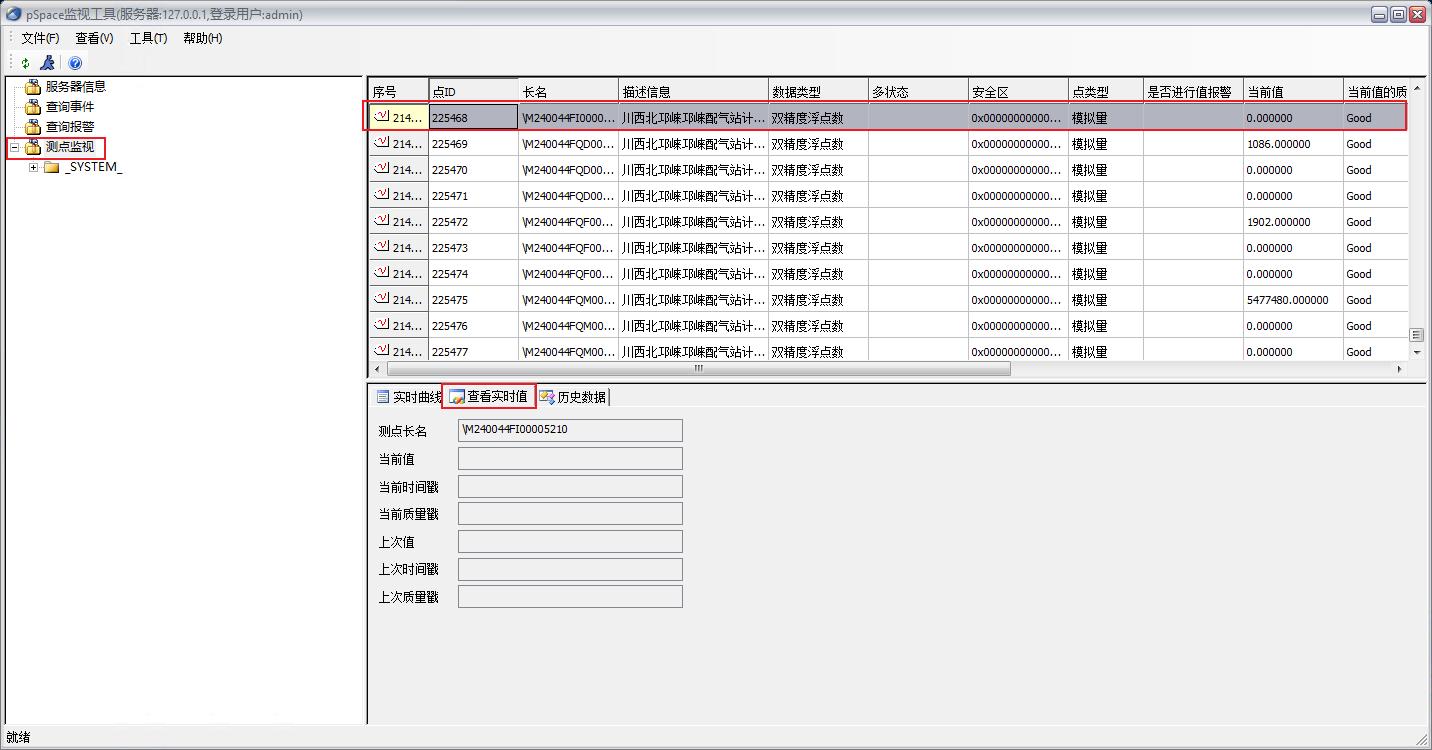 系統(tǒng)將下方各二級單位提供的現(xiàn)場實(shí)時(shí)生產(chǎn)數(shù)據(jù)進(jìn)行實(shí)時(shí)匯總倒當(dāng)前實(shí)時(shí)數(shù)據(jù)庫,可以使用pSpace管理工具psMonitor來對下方的數(shù)據(jù)進(jìn)行的實(shí)時(shí)的查看,查看當(dāng)前數(shù)據(jù)的質(zhì)量狀態(tài),以及時(shí)間戳等重要數(shù)據(jù)。