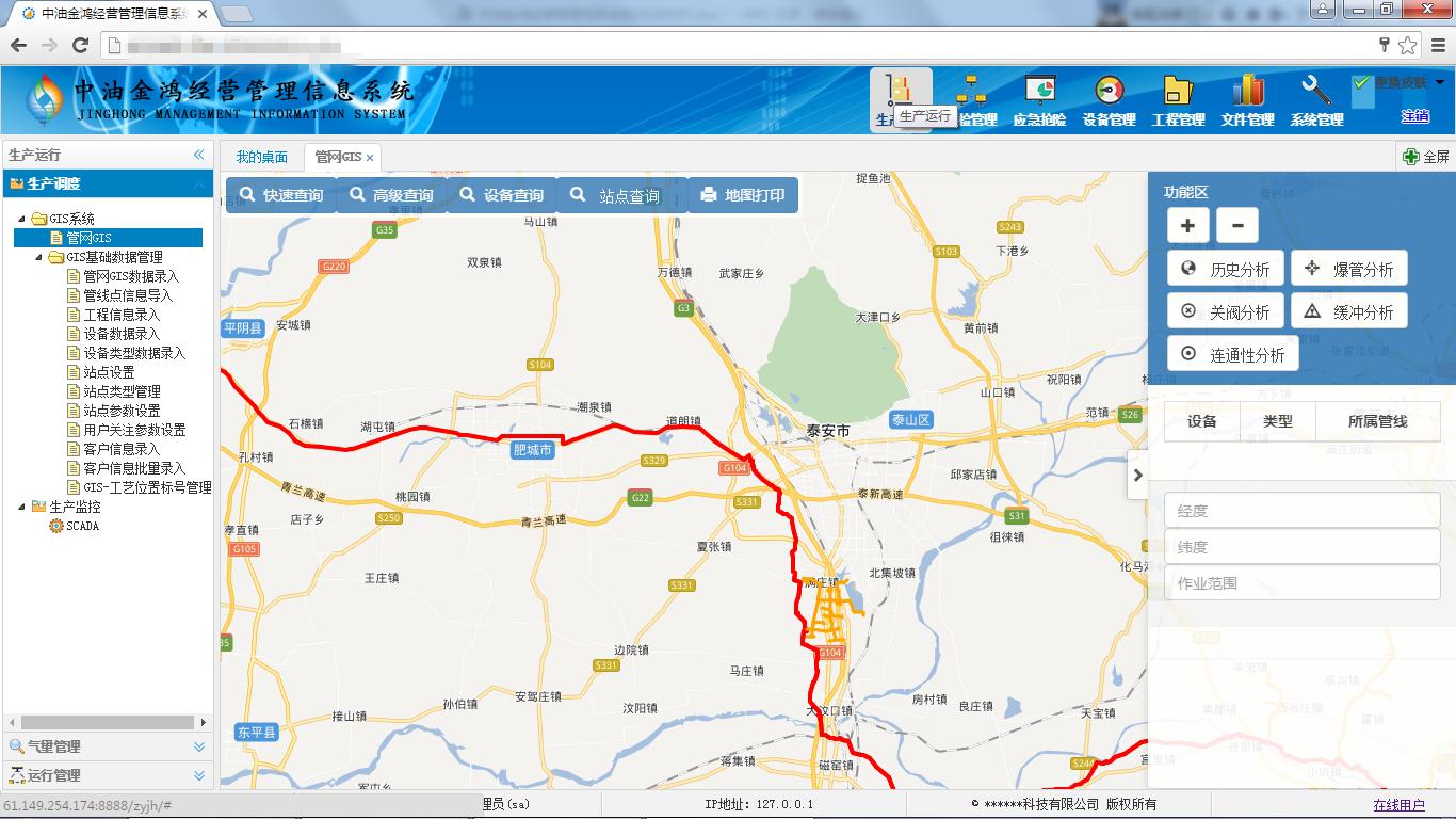 ● 實(shí)時(shí)管網(wǎng)監(jiān)測(cè),以生產(chǎn)調(diào)度為主線的生產(chǎn)運(yùn)行管理系統(tǒng)可以實(shí)時(shí)監(jiān)測(cè)工藝、生產(chǎn)、地理信息、視頻等信息,掌握整個(gè)管網(wǎng)的運(yùn)行情況。