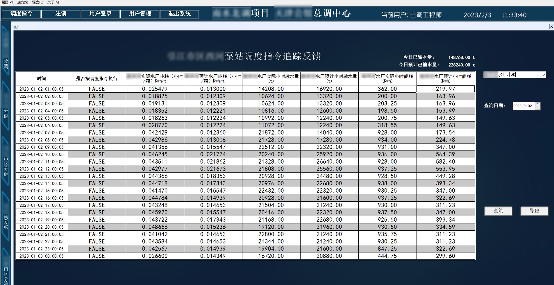 通過智能優化調度系統在天津某河段水廠實際投入使用后連續48小時不間斷運行數據評價,兩日分別供水49萬m3和50萬m3,日均單位能耗0.022kwh/m3。單位能耗誤差0.01%,說明節能優化系統運行穩定。
