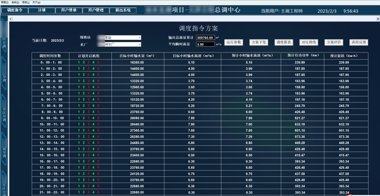 項目中線配套工程,所轄12個泵站,所配水泵累計功率36900KW/h,年電費近1億元。根據生產調度設計文件要求在前一日接到本日24小時的調度任務后,智能優化調度執行系統在0點前規劃出次日24個時段指定水量下的最優節能控制策略,下發調度子站執行,并對策略評級持續調優。