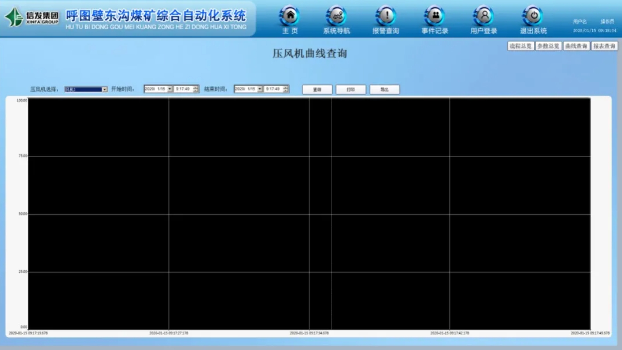 查詢風(fēng)機相關(guān)參數(shù)的歷時曲線對應(yīng)的參數(shù)變化值,可看出參數(shù)變化的趨勢,為工藝優(yōu)化、設(shè)備的安全運行、維修維護保養(yǎng),提供參考依據(jù)與系統(tǒng)曲線比較找出最佳工況點。