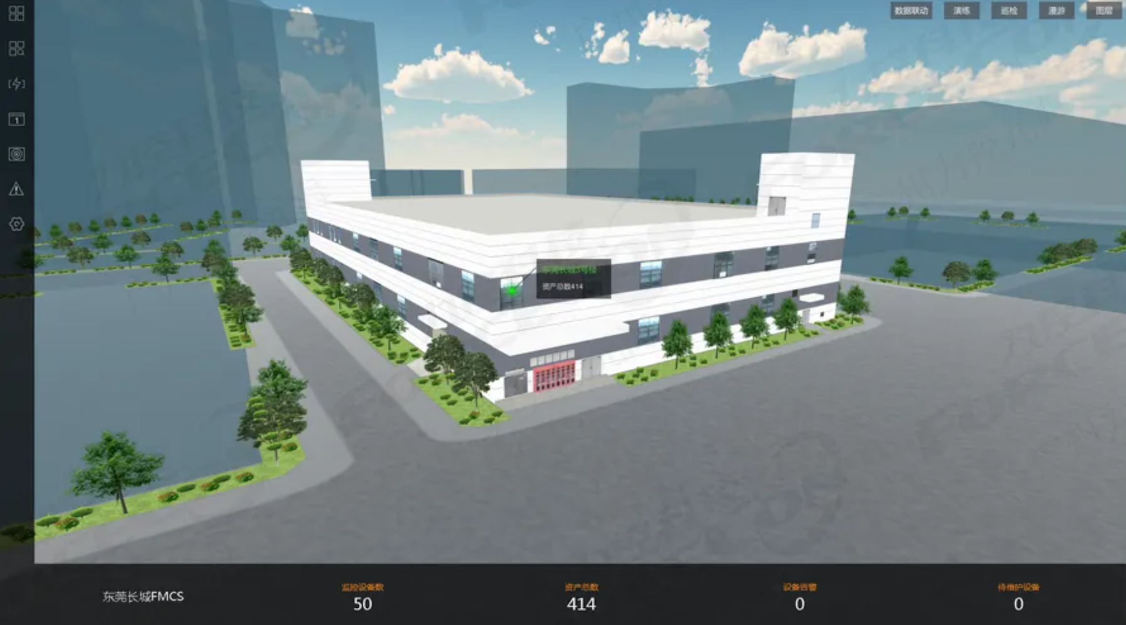 在建成的平臺中,通過將現實物理工廠的建筑樣貌、樓層結構、設施設備、配電房等以三維可視化的形式呈現在虛擬工廠中,以真實、直觀的模型對整個現實物理工廠中各個區域的設備數據、設備狀態等實現監控,確保其正常運行。