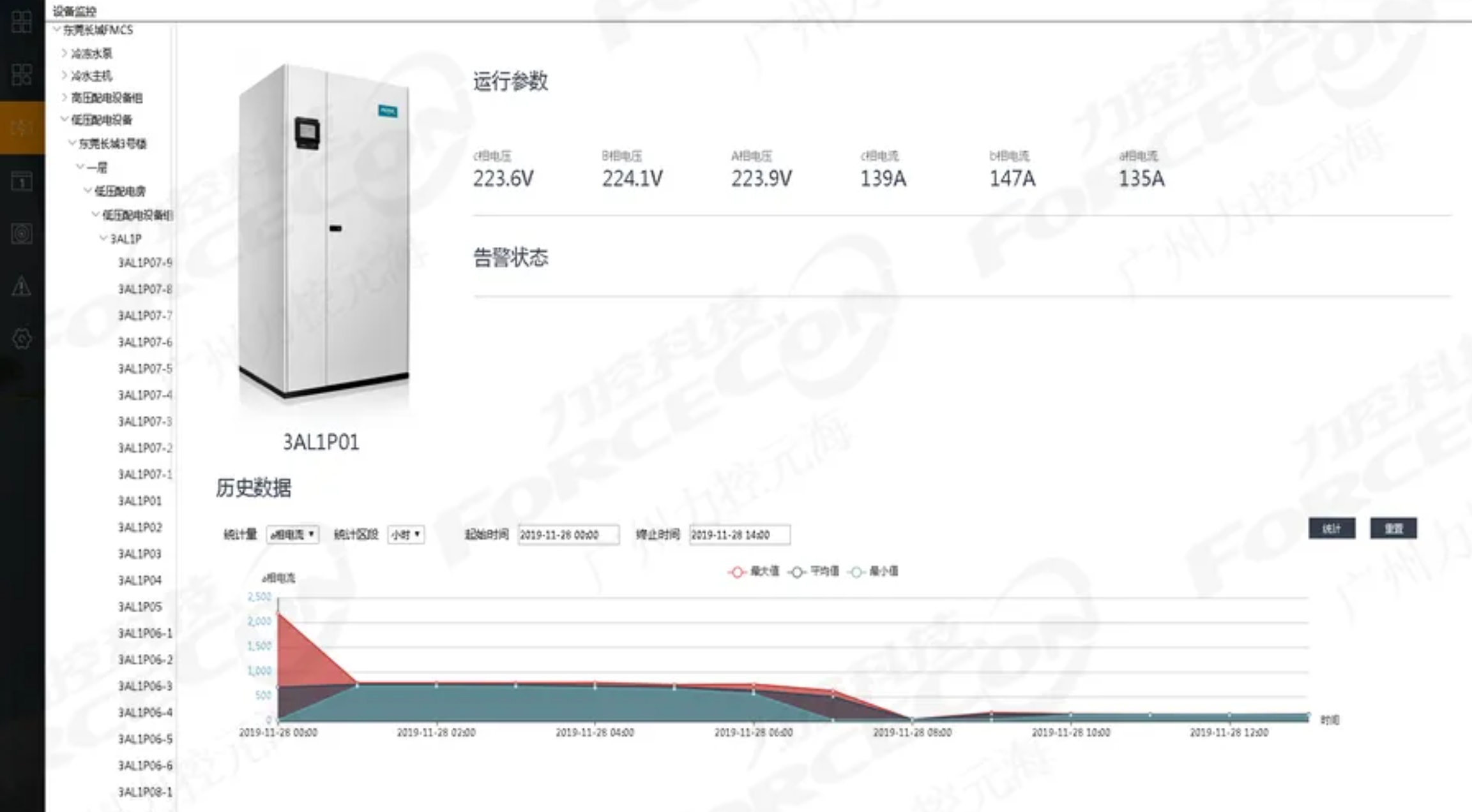 平臺能夠及時對設備發生的故障進行報警,并對接報警信息,點擊報警信息即可自動定位到設備處,快速展開相關設備的報警詳情。在三維場景中,還會在報警設備處顯示醒目報警標簽。