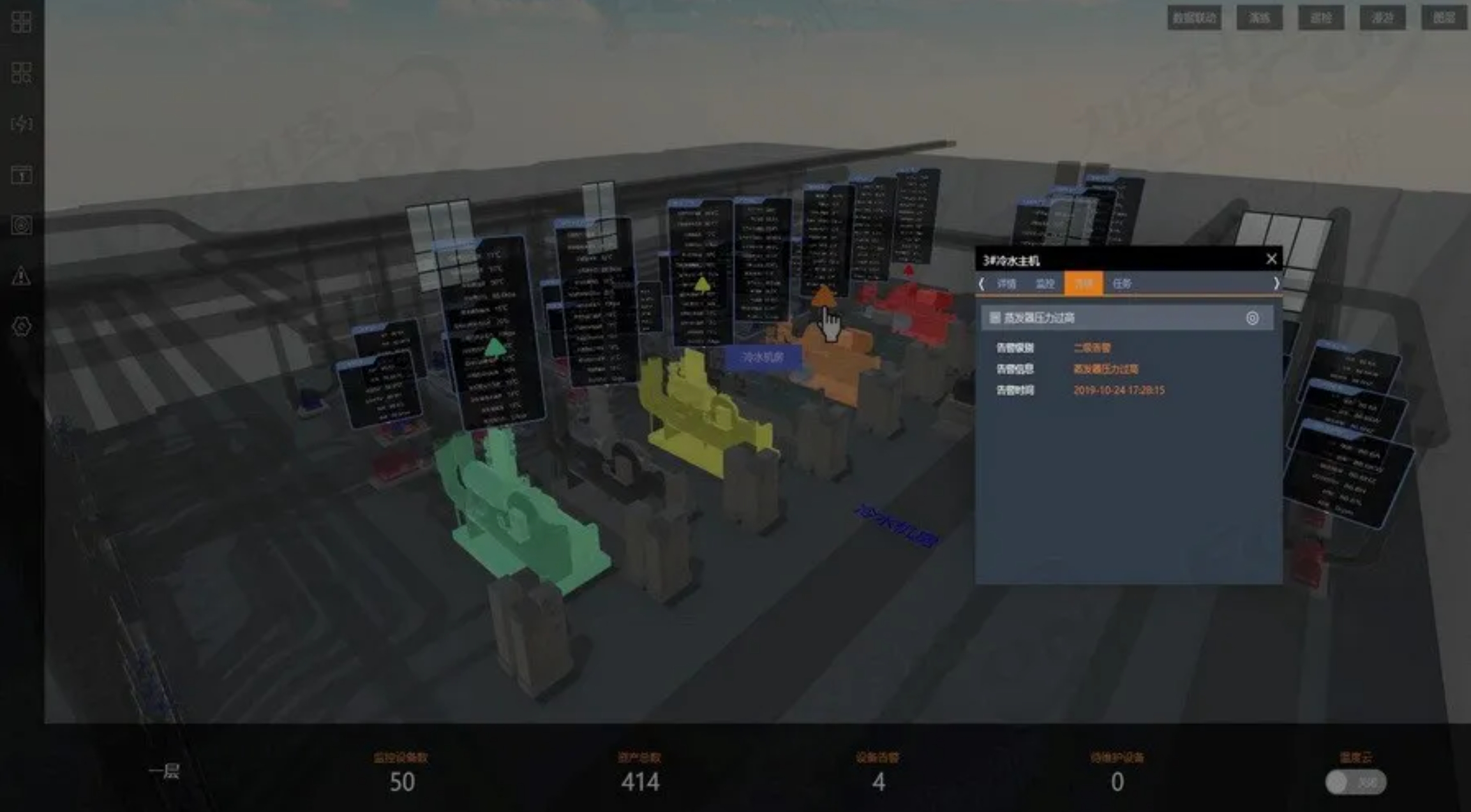 實時監控是整個FCVP 3D可視化平臺中的重要組成部分之一,在數字化虛擬工廠中,通過pSpace對接的實時數據支撐,就能夠在相關場景中查看到工廠的設備監控數據、告警狀態以及歷史數據的統計。在此之上,還能夠為專業向的工作人員提供數據記錄及參考,方便工作人員進行數據的記錄統計、對比預測以及對整體計劃進行調整。