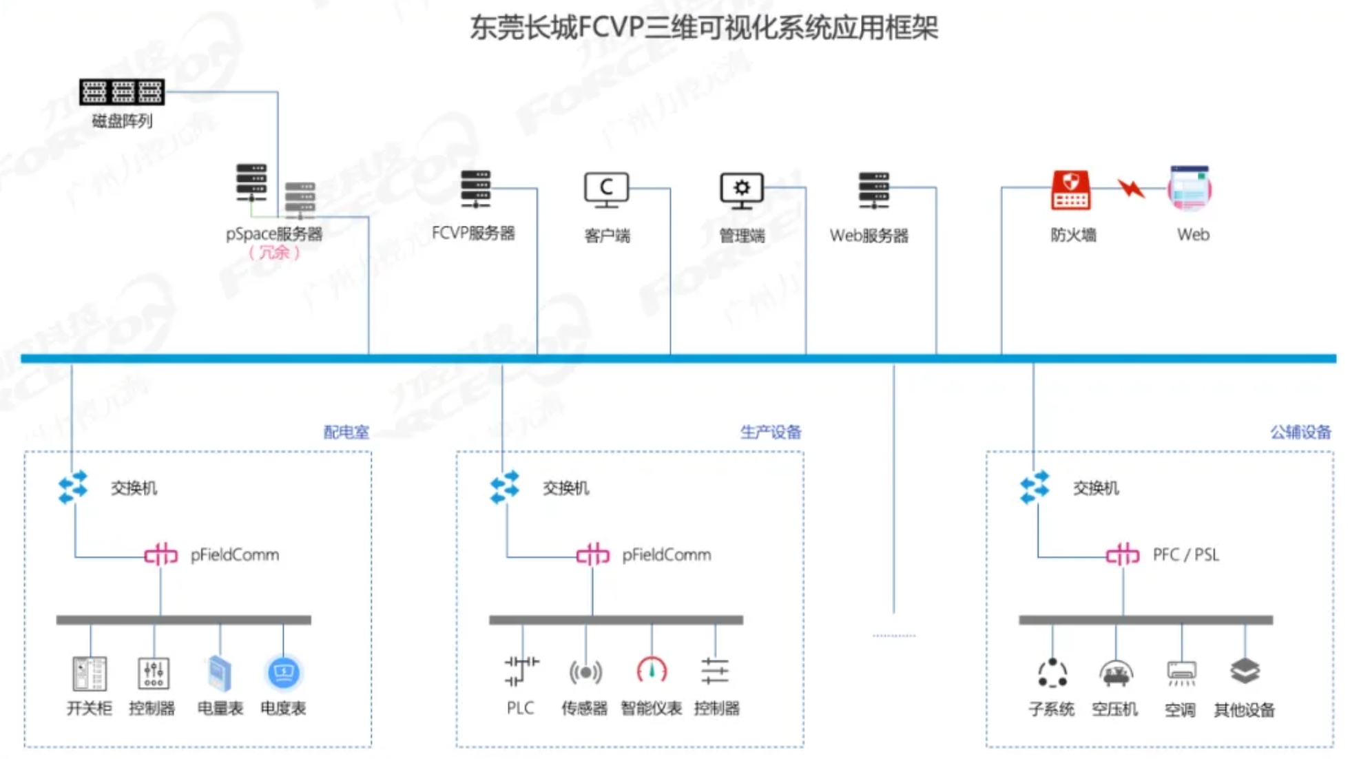東莞長城采用力控自主研發的產品企業級實時歷史數據庫pSpace、三維可視化平臺FCVP,將其實際存在的工廠成功轉化為數字孿生工廠,通過將工廠、車間、產線、工藝基于物理現實在數字空間中建模,并采用數據采集與仿真分析相結合的手段,來反映物理現實中的實際運行狀態,達到預測和控制的最終目標。