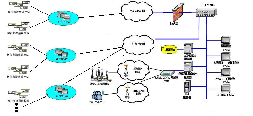 調(diào)度中心站以河道堤防管理處為中心站,承擔(dān)著計(jì)算機(jī)網(wǎng)絡(luò)的管理以及與上級(jí)市水利局聯(lián)網(wǎng)的任務(wù)。中心站對(duì)整個(gè)系統(tǒng)各個(gè)閘站具有管理、調(diào)度控制權(quán),并對(duì)閘控全過(guò)程和視頻圖像進(jìn)行實(shí)時(shí)監(jiān)視,實(shí)現(xiàn)遠(yuǎn)程遙視、遙測(cè)、遙調(diào)、遙控和“遙診”;沿堤設(shè)立的分中心站,完成對(duì)所控閘門(mén)(閘站)閘控和視頻監(jiān)視,并通過(guò)網(wǎng)絡(luò)向調(diào)度中心傳送各閘站的信息;各工作閘站為該網(wǎng)絡(luò)的終端,負(fù)責(zé)對(duì)各種數(shù)據(jù)的采集以及本地手動(dòng)/自動(dòng)控制功能。中心站、分中心站和閘站間通過(guò)光纖或無(wú)線網(wǎng)絡(luò)連接。全網(wǎng)計(jì)算機(jī)可實(shí)時(shí)觀察各閘站閘門(mén)狀態(tài)和監(jiān)視視頻圖像畫(huà)面,并可進(jìn)行其他信息的傳輸和共享。