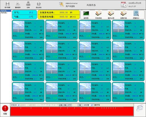 1) 系統(tǒng)的監(jiān)控畫面顯示風(fēng)場(chǎng)所有風(fēng)機(jī)、電網(wǎng)線路、以及其他設(shè)備的運(yùn)行情況,重要的運(yùn)行工況畫面通過一次擊鍵調(diào)出,調(diào)出時(shí)間小于0.5S;調(diào)出任何一幅畫面擊鍵不超過三次,每幅畫面能顯示過程變量的實(shí)時(shí)數(shù)據(jù)和設(shè)備狀態(tài),這些數(shù)據(jù)和狀態(tài)每秒更新一次,顯示的顏色或圖形隨過程工況而變化。系統(tǒng)提供的畫面數(shù)量、每幅畫面的圖素及實(shí)時(shí)更新和被控的過程點(diǎn)幾乎不受限制。系統(tǒng)提供標(biāo)準(zhǔn)的顯示畫面,如風(fēng)場(chǎng)總覽顯示、風(fēng)機(jī)列表顯示、趨勢(shì)顯示、成組顯示、棒狀圖顯示等標(biāo)準(zhǔn)畫面。