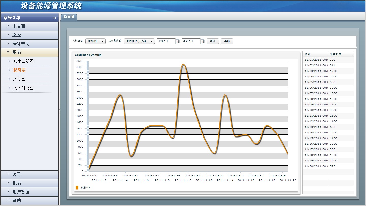 1)風(fēng)速曲線圖:根據(jù)設(shè)定時(shí)間段、數(shù)據(jù)差值,描繪風(fēng)速變化軌跡,并根據(jù)設(shè)定起始風(fēng)速及區(qū)間,自動(dòng)統(tǒng)計(jì)于右側(cè)表格。