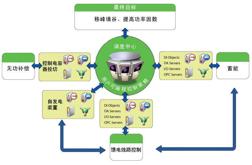 配電及能源優(yōu)化系統(tǒng)從電力專業(yè)的深度對電能消耗進(jìn)行數(shù)字化和集成化的管理、控制和優(yōu)化。系統(tǒng)與無功補(bǔ)償裝置聯(lián)動提高功率因數(shù),通過與自發(fā)電裝置(如太陽能發(fā)電裝置或其他類型發(fā)電裝置)、蓄能裝置的聯(lián)動與交互,完成饋電線路控制,實現(xiàn)移峰填谷。