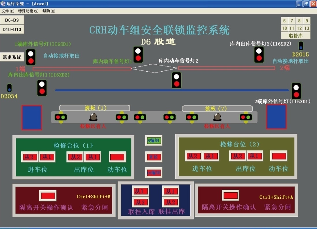 2)動(dòng)車段中修庫(kù)適用于動(dòng)車車輛每運(yùn)行30萬(wàn)公里,主要對(duì)動(dòng)車走行部進(jìn)行更換、維修工作。庫(kù)內(nèi)除檢查庫(kù)的檢修平臺(tái)外,還設(shè)有固定式架車機(jī)、移動(dòng)式架車機(jī)、天車、側(cè)移式接觸網(wǎng)等設(shè)備。除檢查庫(kù)的安全聯(lián)鎖設(shè)備以外,將這些設(shè)備納入到聯(lián)鎖控制系統(tǒng)中。例如:天車和側(cè)移式接觸網(wǎng)之間互鎖,不允許同時(shí)動(dòng)作;移動(dòng)式架車機(jī)和固定式架車機(jī)的復(fù)位信號(hào)作為允許車輛動(dòng)作的必要條件。