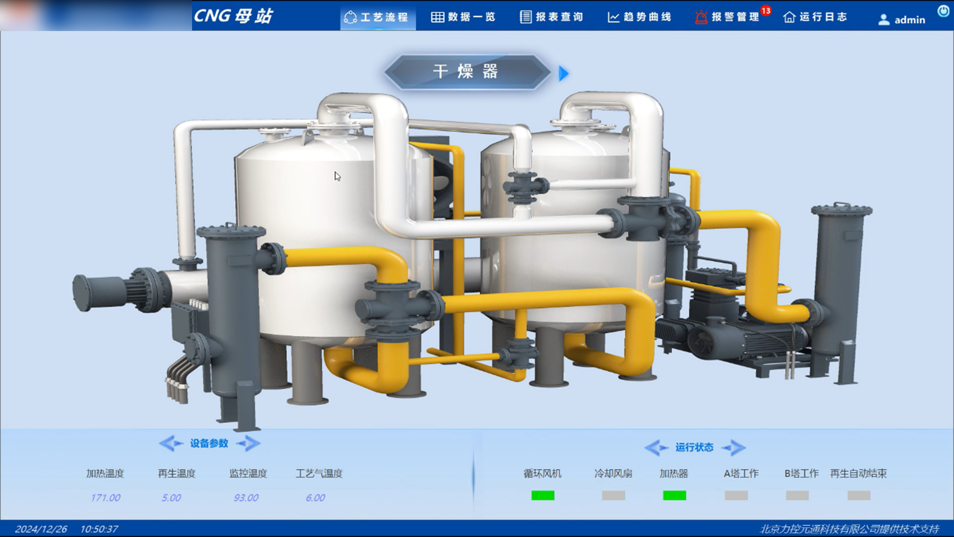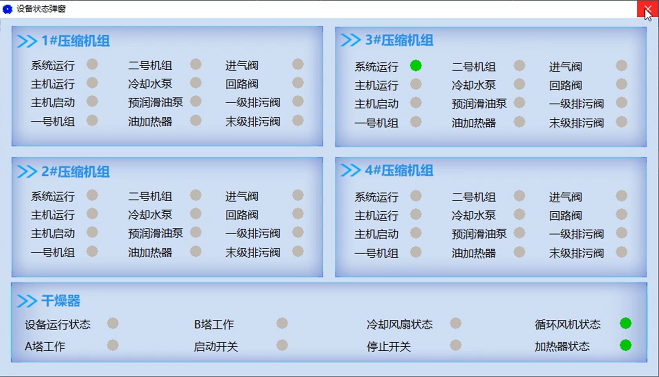 設備數據采用雙維度展示,既可通過總覽表格集中呈現壓縮機、干燥器等核心設備的溫度參數(加熱/再生/工藝氣溫度)及部件狀態(風機/風扇/塔工作狀態),也可切換至單設備專屬頁面查看詳情。