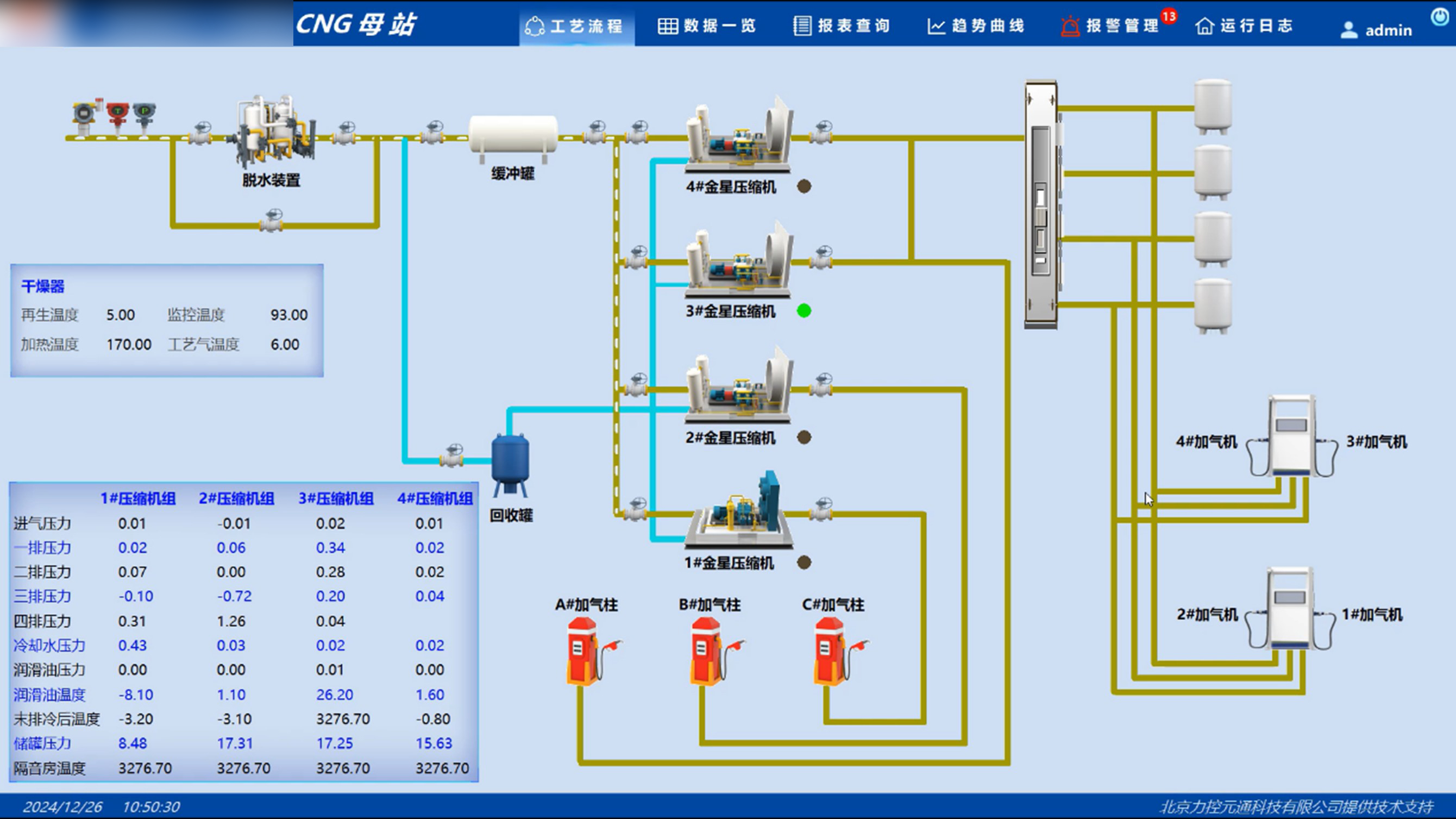 工藝流程模塊動態展示氣體從進站到加注的全過程,實時顯示設備啟停狀態、模擬量變化及氣體流向,支持點擊設備調取工藝參數文本框及趨勢曲線分析。