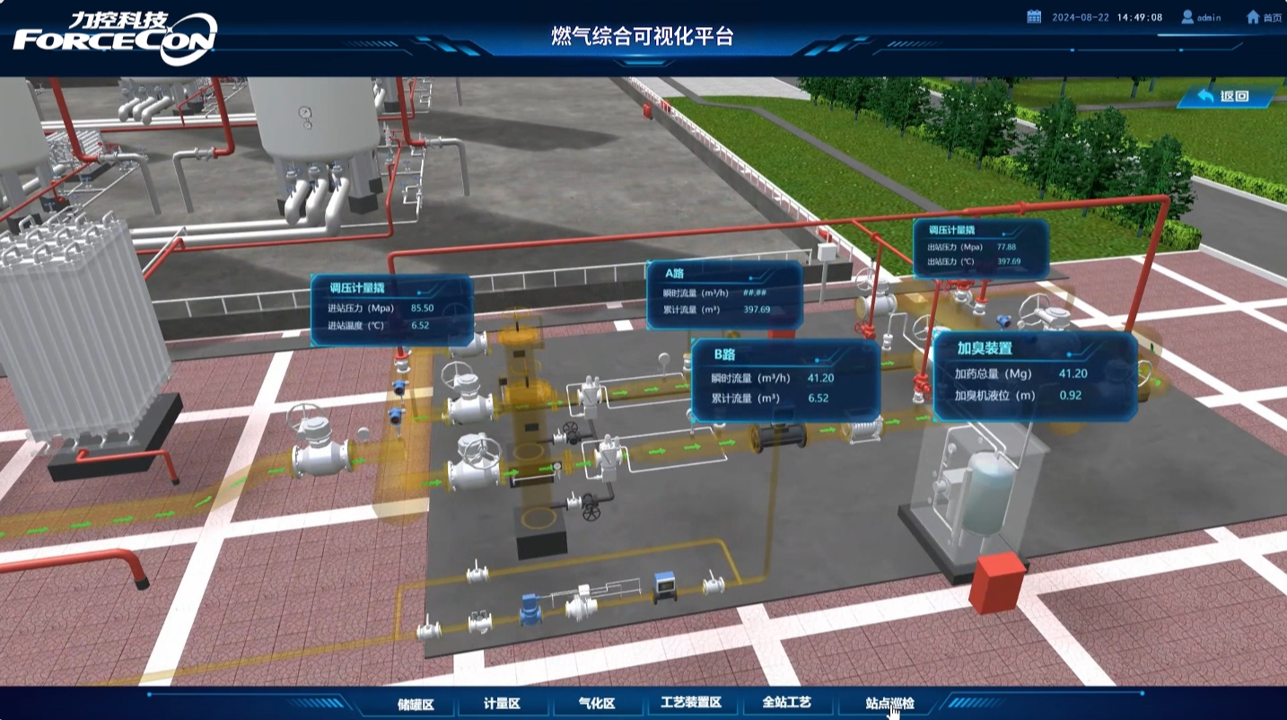 力控天然氣場站綜合管理系統的全流程工藝監控,可直觀展示場站設備布局與實時運行狀態,支持動態更新壓力、溫度、流量、瞬時值、累積值、計劃值等關鍵參數,顏色變化與動態移動效果可直觀反映異常波動。