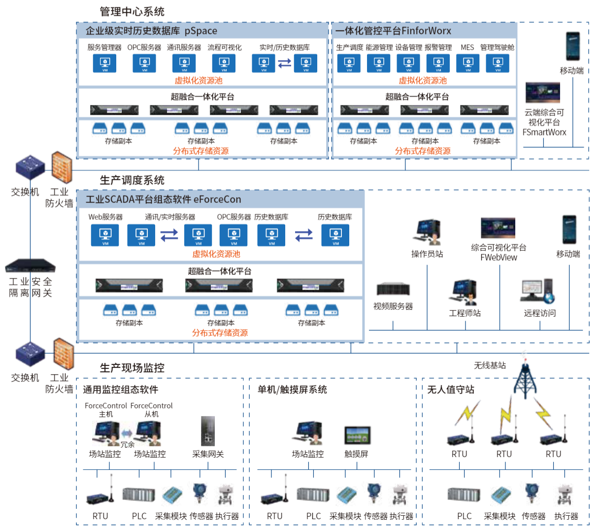 力控工業自動化系列軟件通過分布式實時數據庫實現系統間的高效集成、級聯及擴容,可以自由構建不同規模的應用,完成從底層工業現場控制 (小型場站系統、嵌入式HMI)、到生產調度指揮管理 (SCADA) 及上層信息化管理 (MES、ERP)的一體化集成。