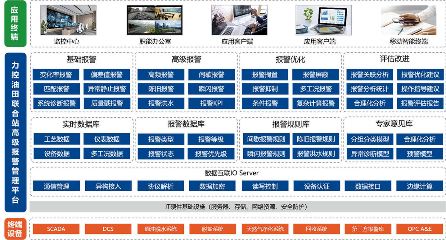 力控油田聯(lián)合站高級報警管理平臺,通過緩存技術(shù)保障高效的數(shù)據(jù)接入查詢,支持各類SCADA、DCS、第三方報警庫及OPC·A&E等報警數(shù)據(jù),對報警數(shù)據(jù)進行收集整定和標(biāo)準(zhǔn)化處理,完成信息補全,計算識別各報警點間的相關(guān)性,對報警源頭進行重點監(jiān)測和控制,并以專家知識庫為基礎(chǔ)建立預(yù)警模型,輔助操作人員及時作出判斷和調(diào)整,降低事故發(fā)生的概率,保障生產(chǎn)安全。