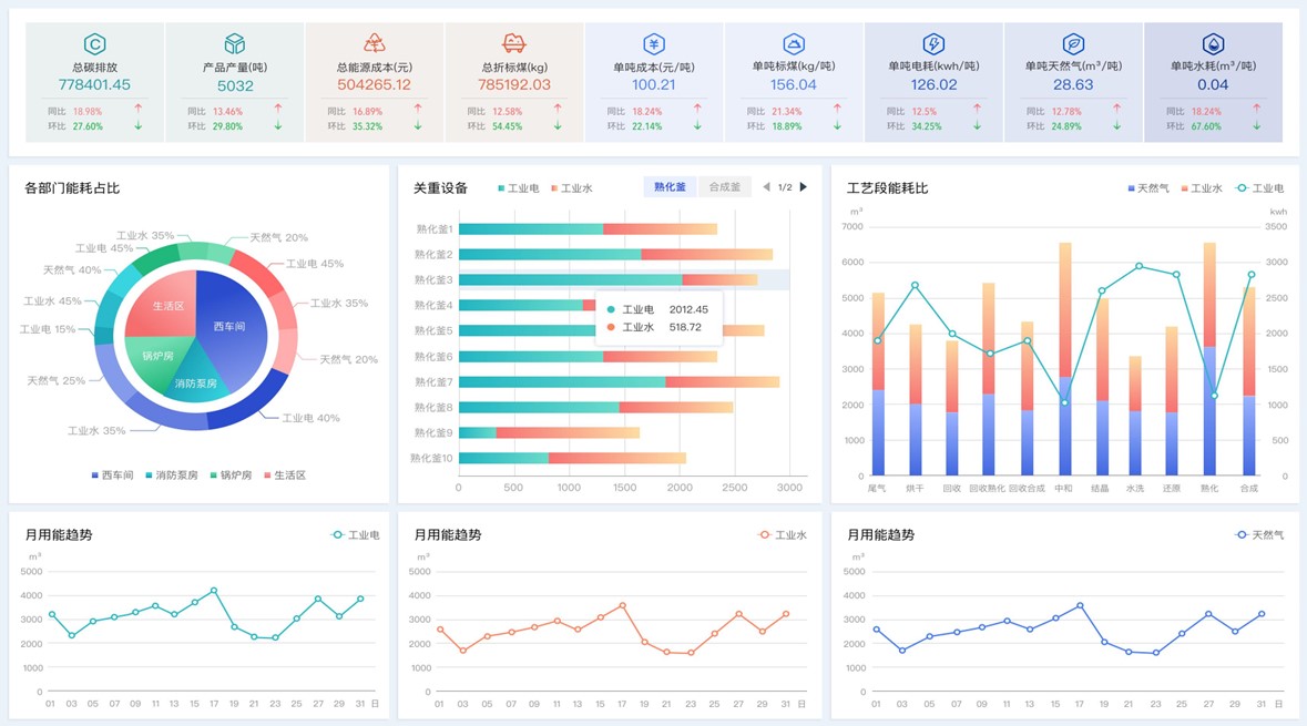 平臺結合用能指標、報警策略,實現能耗超標智能報警。根據能耗實時監測、變化趨勢、產量、生產計劃,預測企業用能負荷、未來消耗量。結合折標系數、碳排放系數,實現標準煤轉換、碳中和管理。