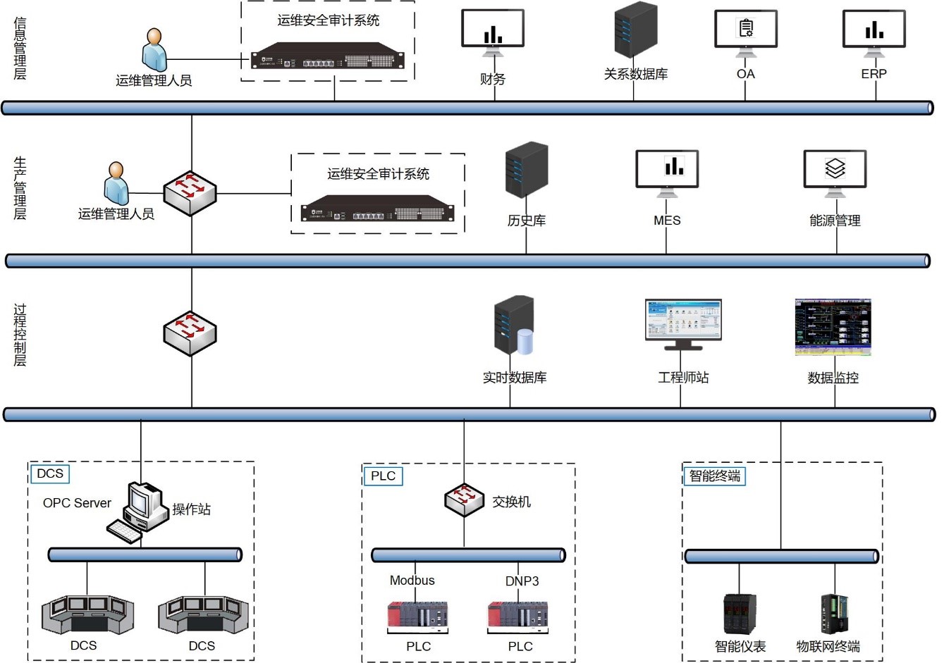 在信息管理層和生產(chǎn)管理層部署堡壘機,對服務(wù)器、網(wǎng)絡(luò)設(shè)備、安全設(shè)備進(jìn)行日常操作與運維的安全防護,使用數(shù)字證書作為數(shù)據(jù)庫系統(tǒng)身份認(rèn)證方式。強制規(guī)定密碼復(fù)雜度規(guī)則、密碼有效時限、密碼長度、密碼嘗試次數(shù)、密碼鎖定等。僅設(shè)置一位管理員具備系統(tǒng)權(quán)限,其余數(shù)據(jù)庫賬號僅授予能夠滿足使用需求的最小權(quán)限。堡壘機扮演著看門者的職責(zé),所有對網(wǎng)絡(luò)設(shè)備和服務(wù)器的請求都要從這扇大門經(jīng)過。因此安全管理與審計系統(tǒng)能夠攔截非法訪問和惡意攻擊,對不合法命令進(jìn)行阻斷、過濾掉所有對目標(biāo)設(shè)備的非法訪問行為并記錄詳細(xì)信息。堡壘機具備輸入輸出審計功能,不僅能夠詳細(xì)記錄用戶操作的每一條指令,而且能夠?qū)⑺械妮敵鲂畔⑷坑涗浵聛恚痪邆鋵徲嫽胤殴δ埽軌蚰M用戶的在線操作過程,豐富和完善了網(wǎng)絡(luò)的審計功能。安全管理與審計系統(tǒng)能夠在自身記錄審計信息的同時在外部某臺計算機上做存儲備份,可以極大增強審計信息的安全性,保證審計人員有據(jù)可查。系統(tǒng)管理員可以通過多種查詢條件查看審計信息。堡壘機保護單位內(nèi)部網(wǎng)絡(luò)設(shè)備及服務(wù)器資源的安全性,使得單位內(nèi)部網(wǎng)絡(luò)管理合理化和專業(yè)化。
