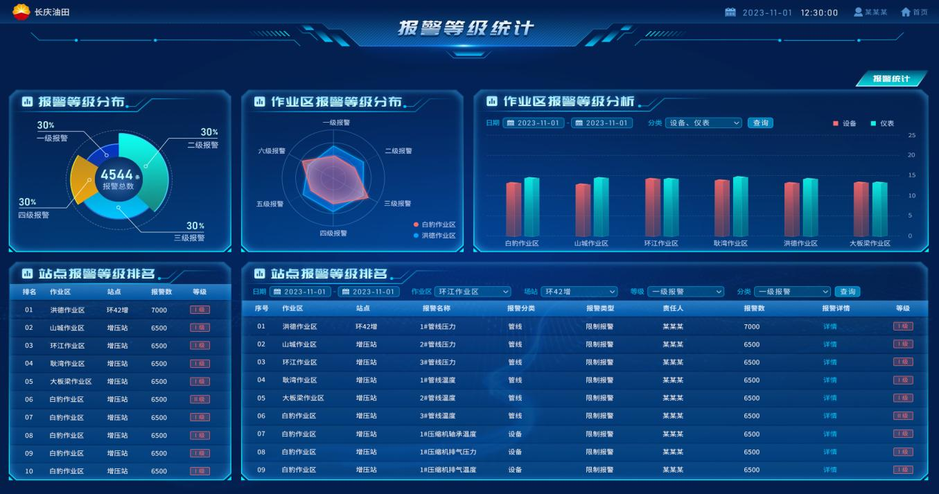 報警平臺實現各類報警數據統一接入平臺,實現集中查看、集中管理,針對中心站、作業區、氣礦等各個層級的報警分析,根據業務需要可自由查看每一級組織機構的報警數據。同時,基于報警合理化分析,可有效減少一線人員的報警量,提高調度人員的工作效率,為下一步“少人值守”奠定的信息基礎。